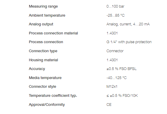 These pressure transmitters are compact and robust. They can be used for a pressure range of 0 to 600 bar and for gaseous, liquid and viscous media. They are equipped with IO-Link, analog output and switch point (PNP/NPN). Process connection: G1/4", G1/2", NPT1/4", R1/4". Housing and process connection in stainless steel. IP67 or IP69K. Customer-specific modifications upon request.