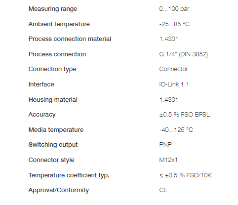 These pressure transmitters are compact and robust. They can be used for a pressure range of 0 to 600 bar and for gaseous, liquid and viscous media. They are equipped with IO-Link, analog output and switch point (PNP/NPN). Process connection: G1/4", G1/2", NPT1/4", R1/4". Housing and process connection in stainless steel. IP67 or IP69K. Customer-specific modifications upon request.